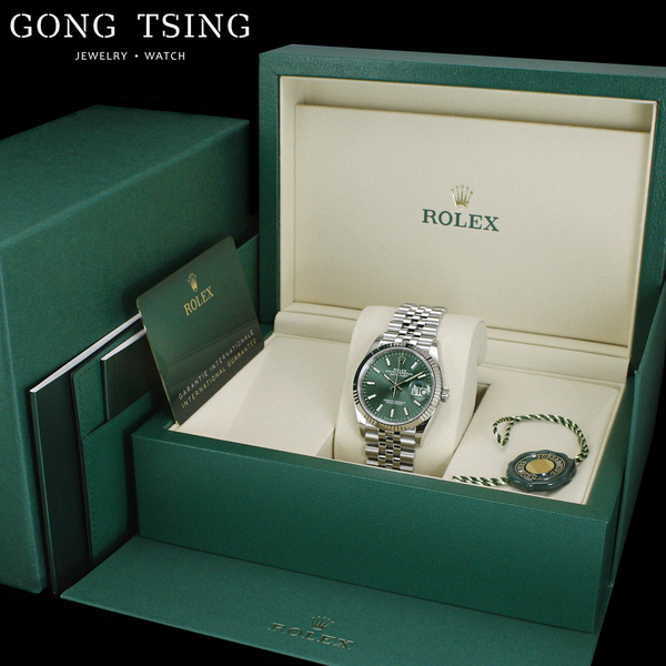 | 特徵 | 原廠(不鏽鋼錶殼.白K金三角坑紋外圈.薄荷綠面盤.五株錶帶.摺疊扣.盒子.綠卡保卡.吊牌.說明書) |